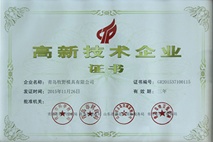 Muye Mold obtained the high and new technology enterprise certificate, jointly issued by Qingdao Science and Technology Bureau, Qingdao Finance Bureau, Qingdao National Tax Bureau of Shandong province and Qingdao Local Tax Bureau.