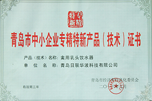 青島日聯華波科技有限公司禽用乳頭飲水器獲得青島市經濟和信息化委員會青島市中小企業專精特新產品(技術)證書;